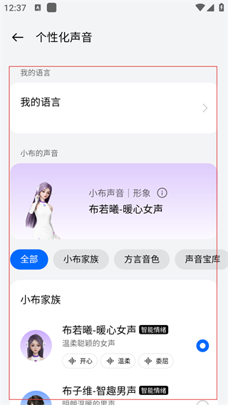 4、进入【个性化声音】页面,可在【小布家族】等分类下选择不同音色(如【布若曦-暖心女声】),设置助手的语音形象。