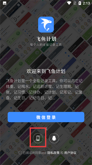 1、在飞鱼计划欢迎页,选择【手机】登录选项,进入该工具对应的账号登录信息填写页面。