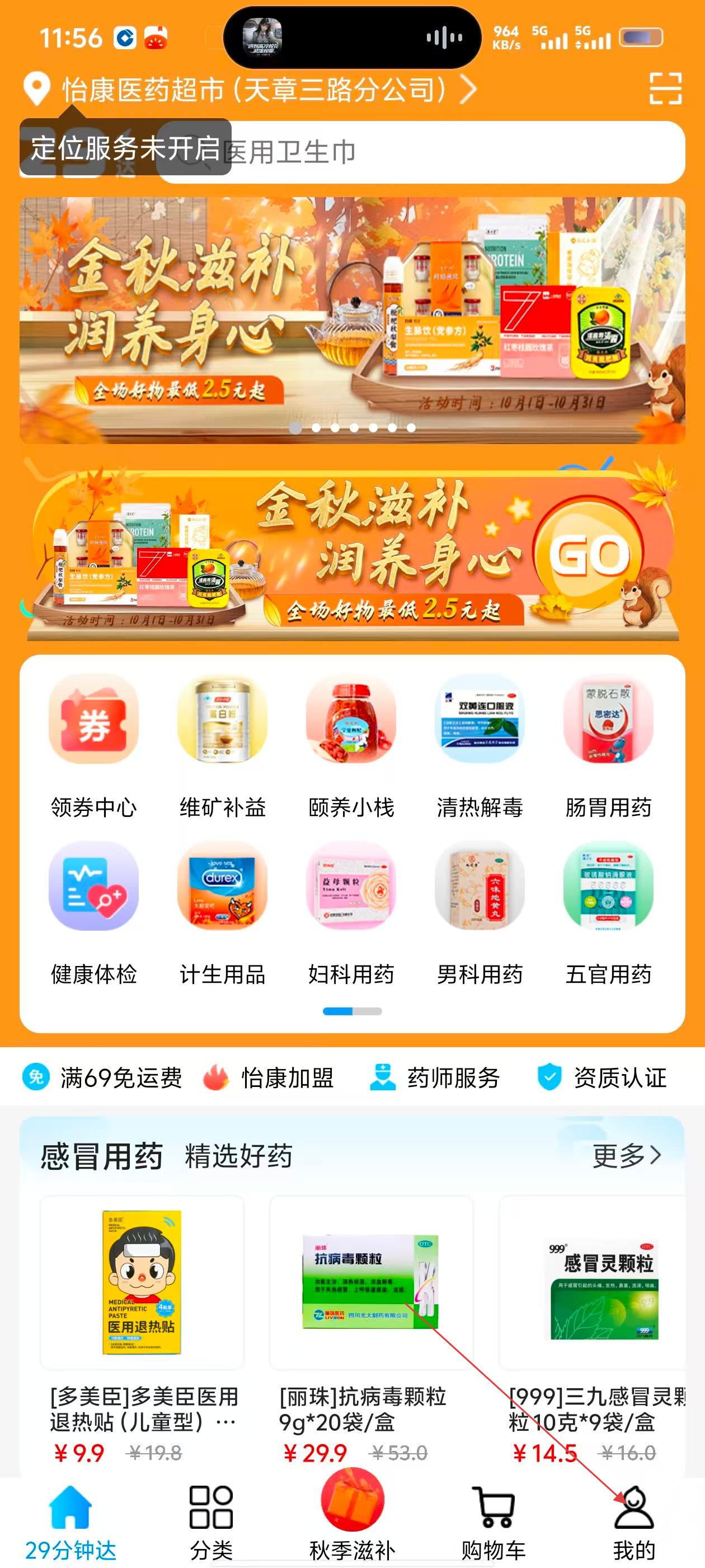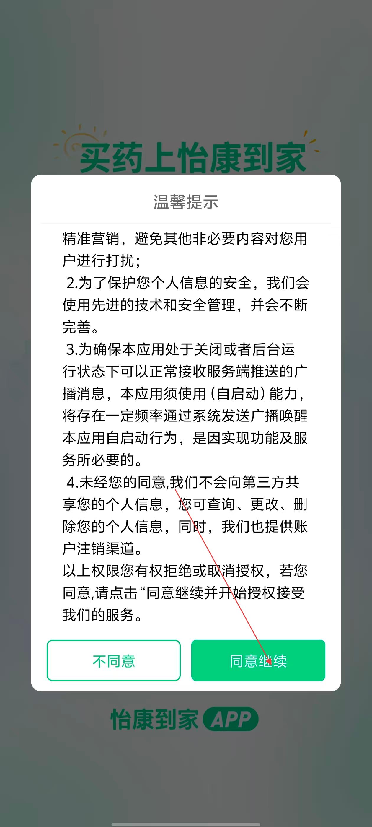 1、打开怡康到家APP,会弹出温馨提示窗口,仔细阅读后点击【同意继续】,进入主界面。