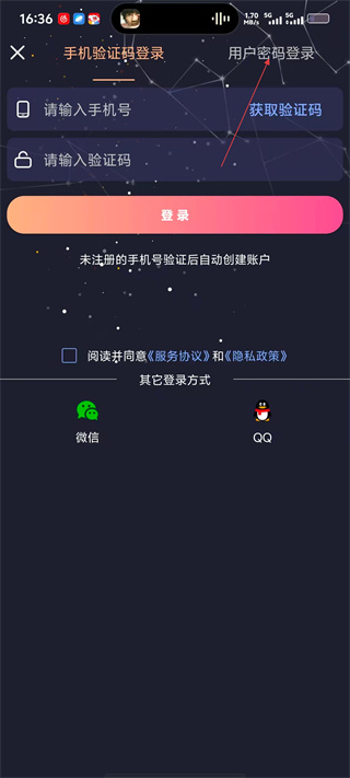 3、在登录页面,选择【用户密码登录】选项,切换至密码登录界面。
