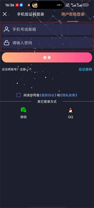 4、在密码登录界面,依次填写手机号或邮箱、密码,勾选“阅读并同意”相关协议后,点击【登录】按钮完成账号登录。