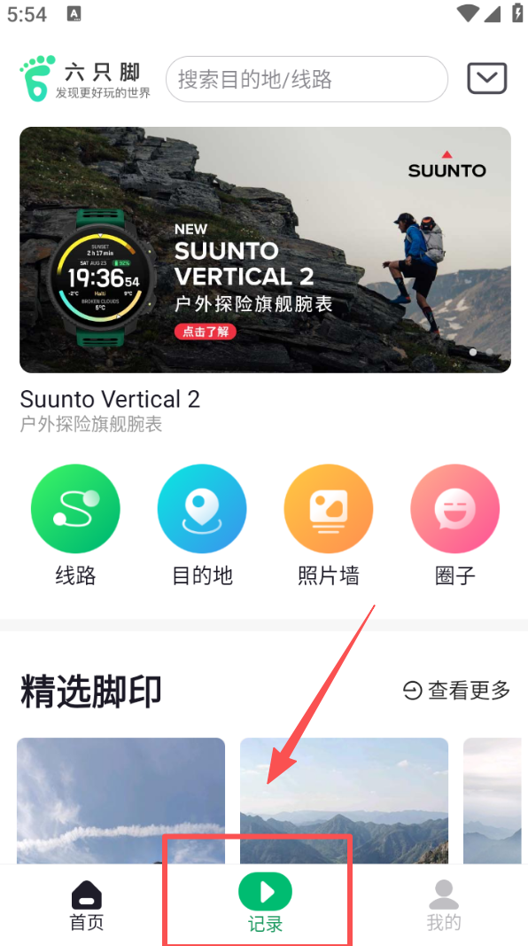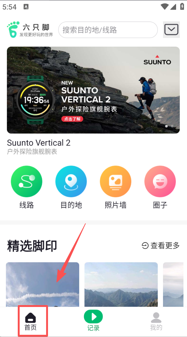 1、点击底部 “首页”,可进入主界面,看到线路、目的地等功能入口以及精选脚印内容。