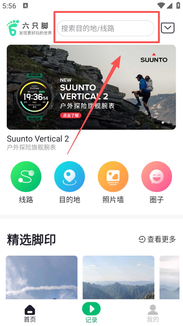4、在首页顶部搜索框,输入目的地或线路,可查找心仪的户外出行路线,开启探索之旅。