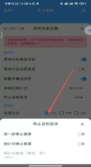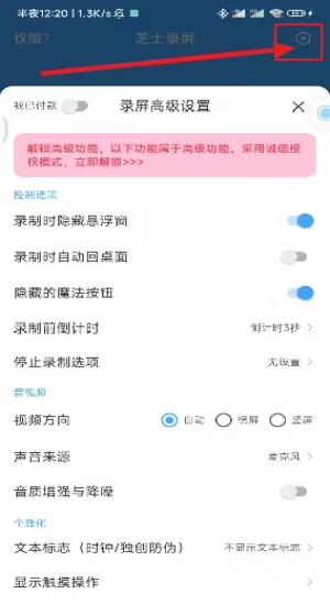 3、进入录屏高级设置解锁隐藏悬浮窗自动回桌面倒计时三秒。