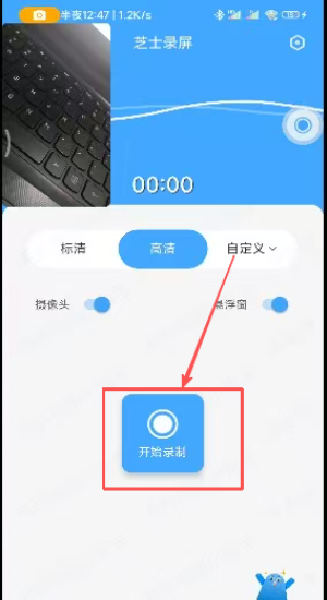 1、打开录屏免费版app,进入首页,首页录屏可设置画质标清、高清、自定义以及开启摄像头和录制声音,点击右上角设置;