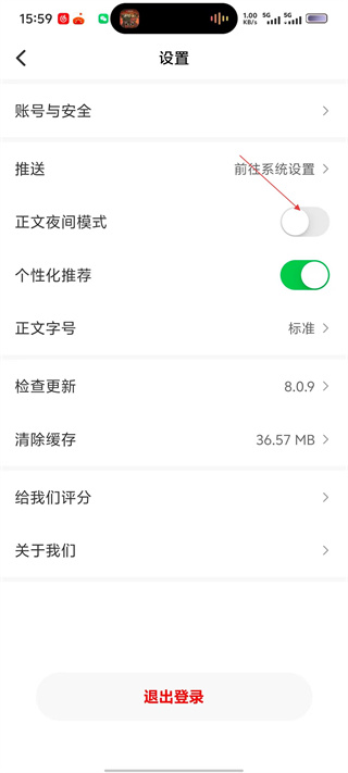 3、在【设置】页面找到【正文夜间模式】选项,当前处于关闭状态,可按需开启调整阅读模式。