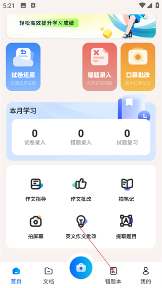 1、首页底部点击【错题本】按钮进入对应页面,可集中管理各学科错题,为后续复习整理奠定基础。