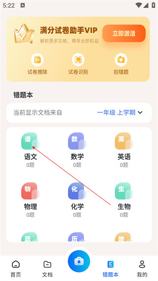 2、在错题本主页面选择【语文】等目标学科,快速筛选对应学科错题,精准定位需巩固的知识点。