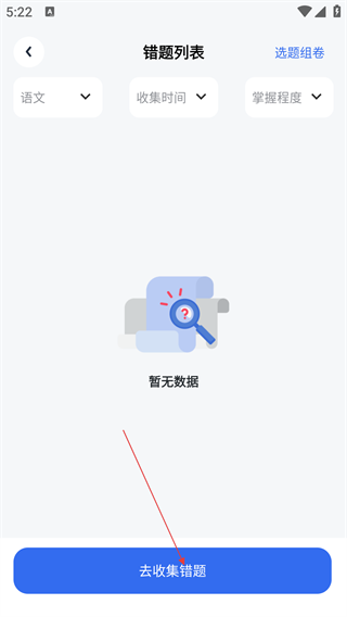 3、若所选学科错题列表无数据,直接点击【去收集错题】按钮,跳转至错题提取操作界面。