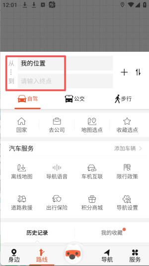 3、设置起点和终点,输入“我的位置”和目的地,获取导航路线。