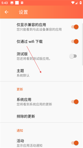 3、在设置页,通用类包含应用兼容性、下载网络限制等开关,“主题”默认跟随系统,更新类可控制系统应用的更新显示。
