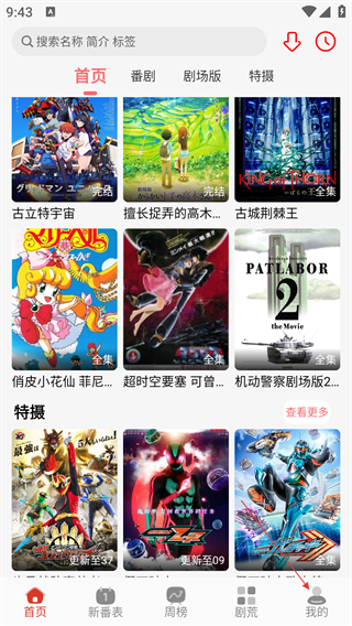1、进入软件主页,可通过顶部搜索栏查找内容,也能切换【番剧】【剧场版】等分类浏览番剧,点击底部【我的】进入个人中心。