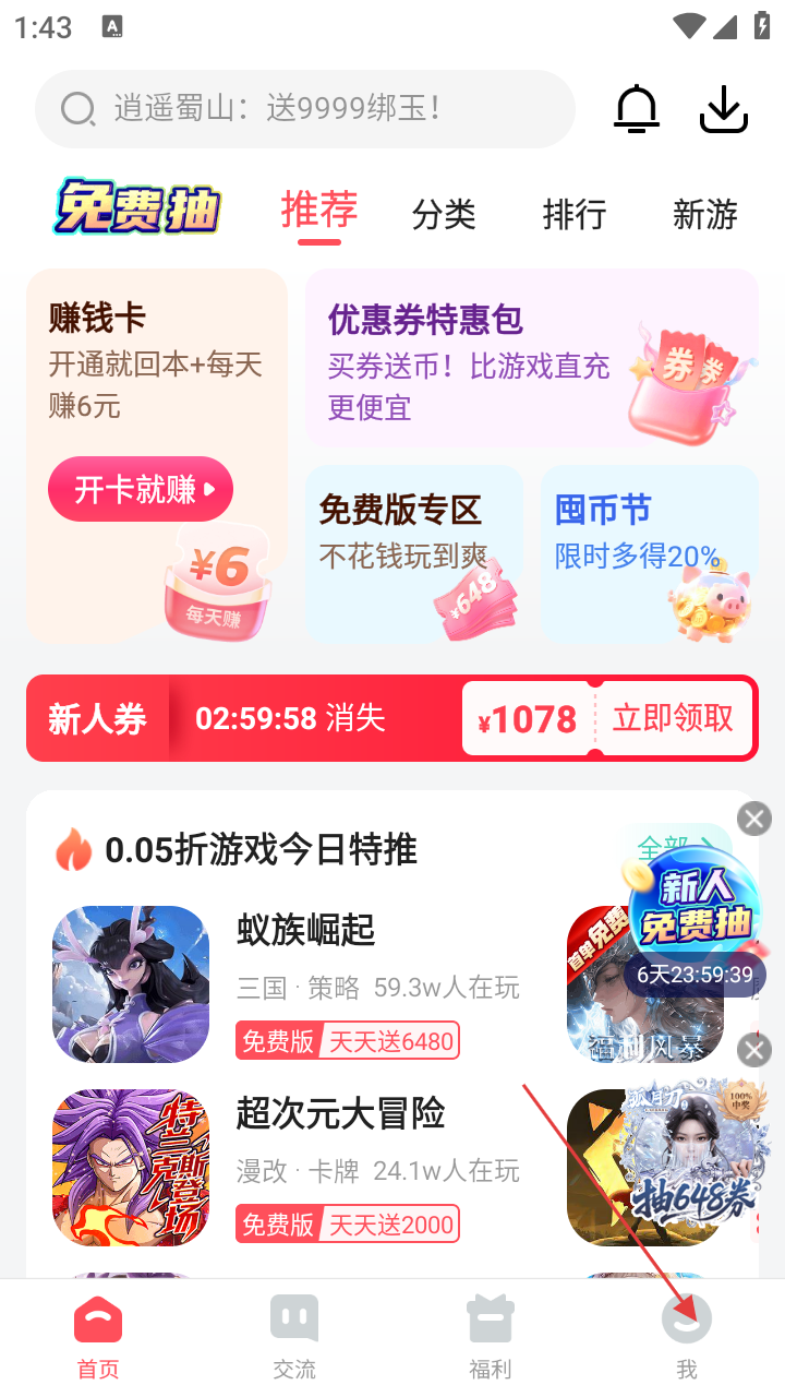 1、在3387游戏首页,若想进入个人相关页面,点击底部【我】,切换到个人页面。