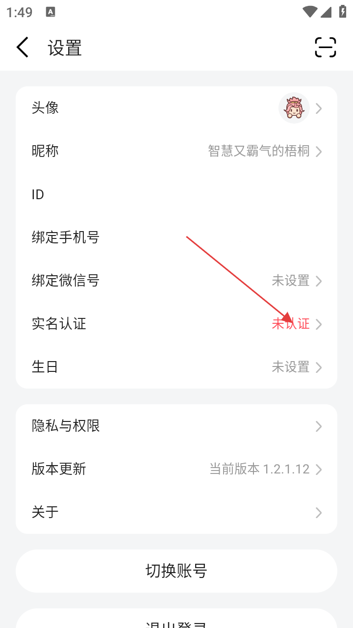 3、在设置页面,若要进行实名认证,点击【实名认证】,进入实名认证页面。