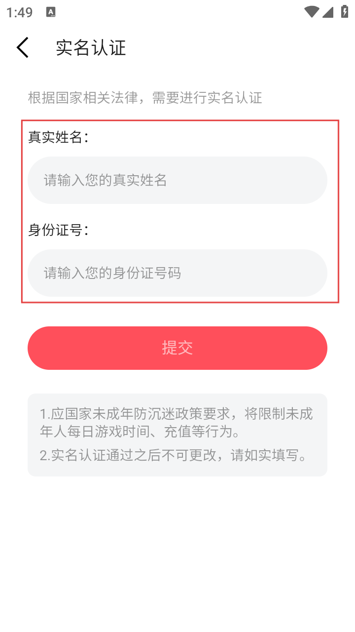 4、在实名认证页面,依次输入真实姓名、身份证号,点击【提交】,完成实名认证。
