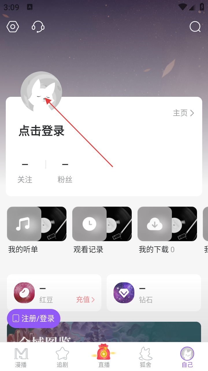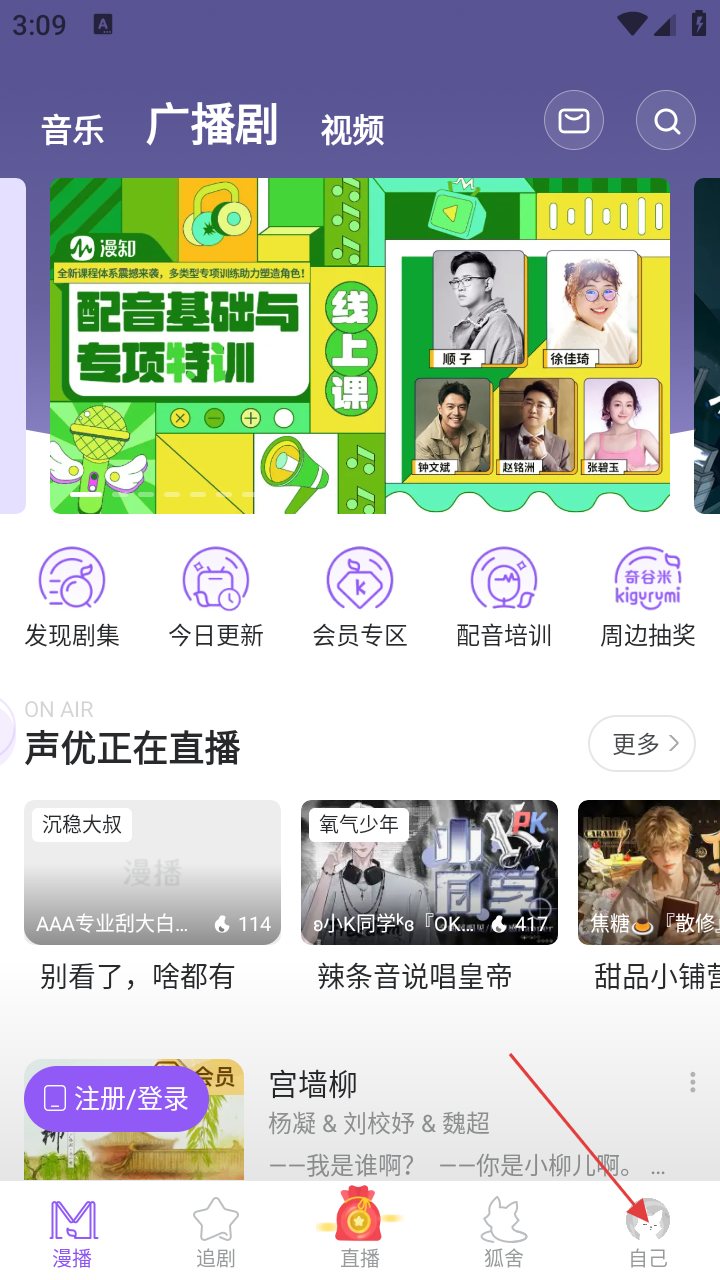 1、在漫播APP首页,可浏览广播剧、音乐、视频等内容,点击【自己】进入个人页面。
