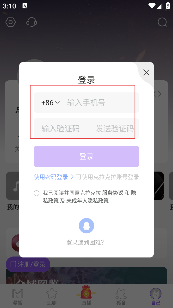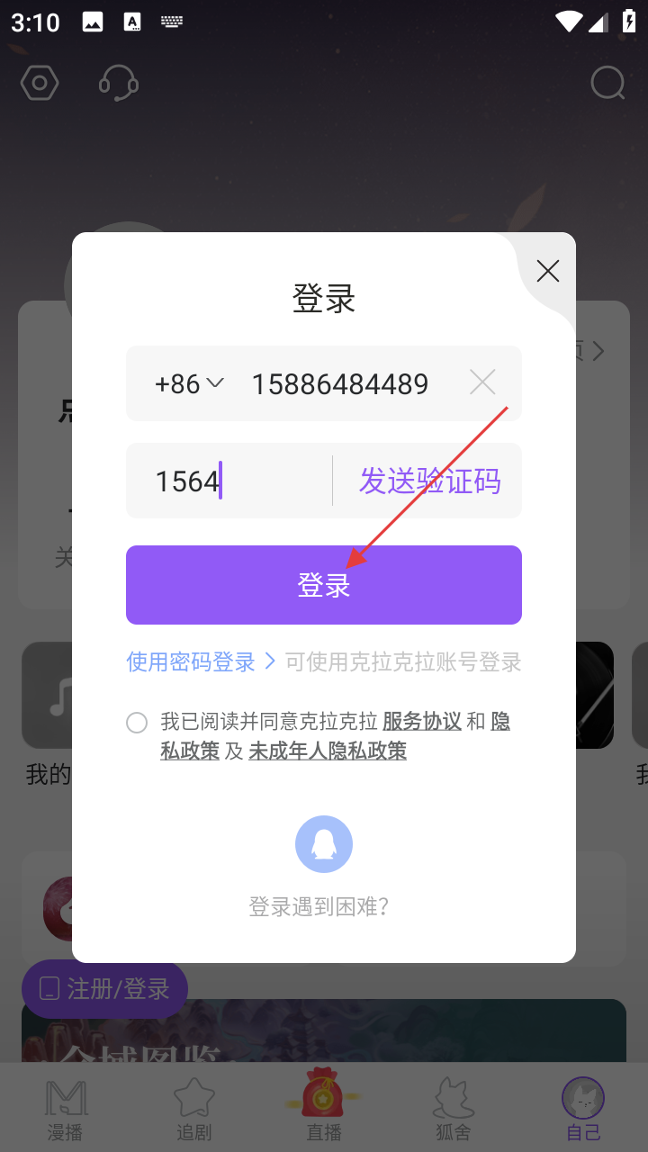 4、输入完成后,点击【登录】即可完成账号登录,开始使用漫播APP的广播剧、直播等服务。