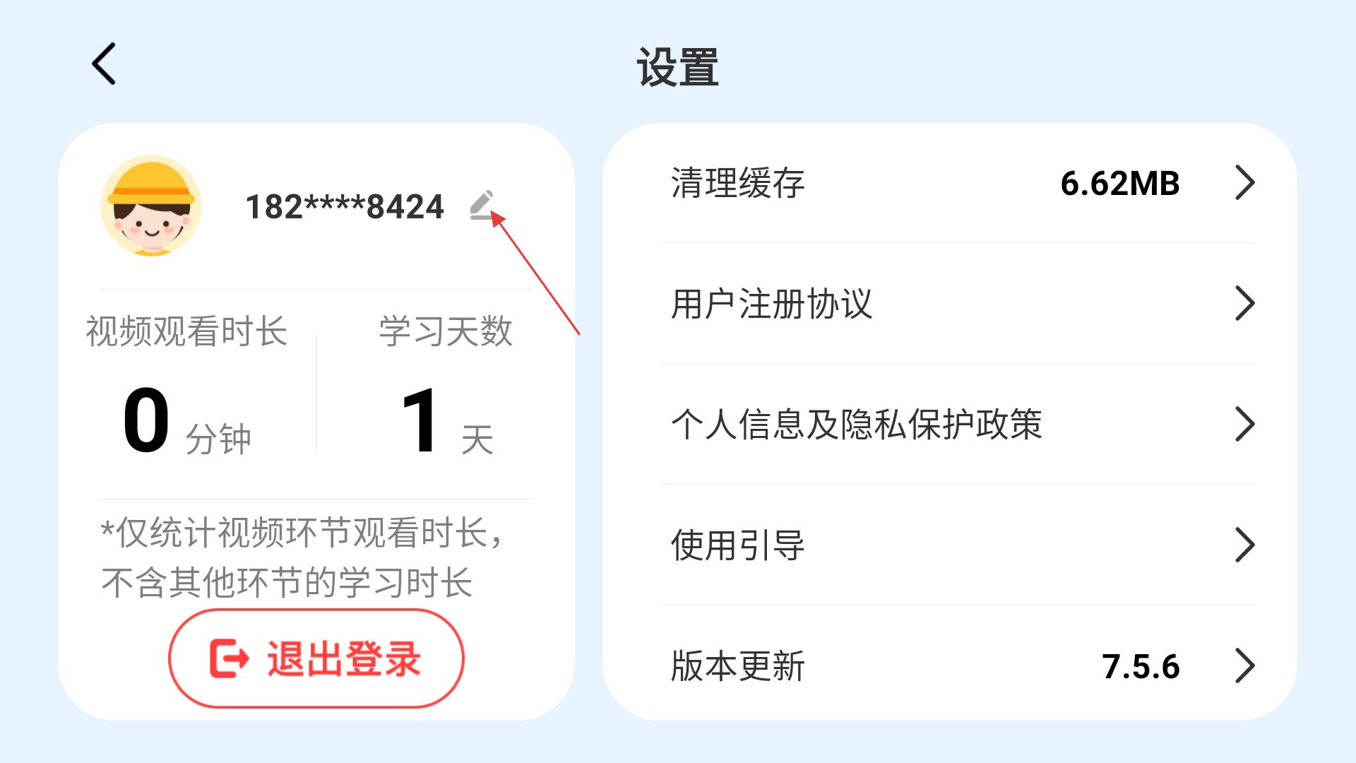 2、进入个人页面,可查看【视频观看时长】【学习天数】数据,点击账号旁编辑按钮。