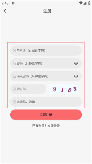 4、注册页面要填【用户名】【密码】及确认密码,还有验证码,邀请码可选填,完成后点击【立即注册】。