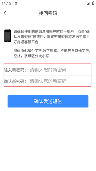 4、在找回密码页面,按要求输入新密码及确认密码,点击【确认发送短信】,完成密码重置。