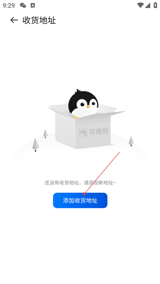 4、在收货地址管理页面,点击【添加收货地址】按钮,按提示填写地址信息,完成收货地址的添加。