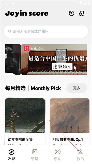 1、进入【乐其爱乐谱】后,可通过顶部搜索框输入乐谱名或作曲家找谱,也可在【每月精选|Monthly-Pick】板块浏览推荐乐谱。