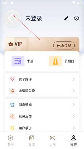 2、点击底部【我的】进入个人页面,若需返回可点击左上角返回箭头,该页面还可使用【求谱】【节拍器】等功能。