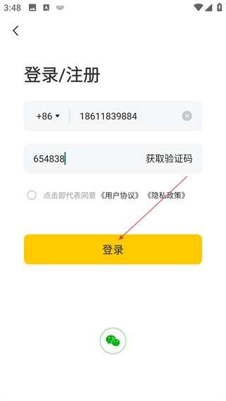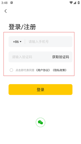 3、在登录界面,可选择输入手机号获取验证码登录,也可点击底部微信图标用微信登录,需注意勾选同意《用户协议》《隐私政策》。