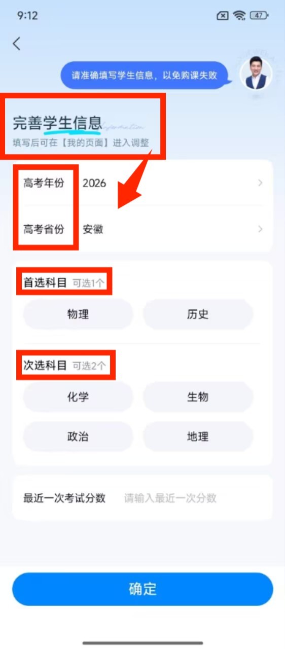 1、进入完善学生信息页面,填写高考年份、省份及选考科目,确认后点击 “确定” 完成信息配置。
