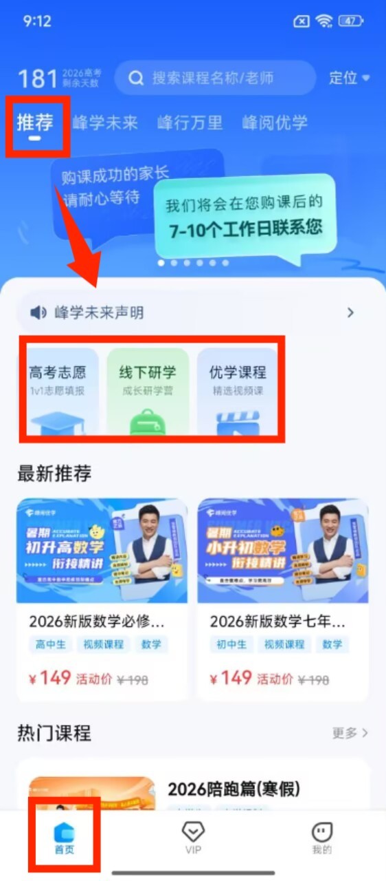 2、切换到首页推荐板块,选择高考志愿、线下研学等功能,浏览最新推荐的课程资源。
