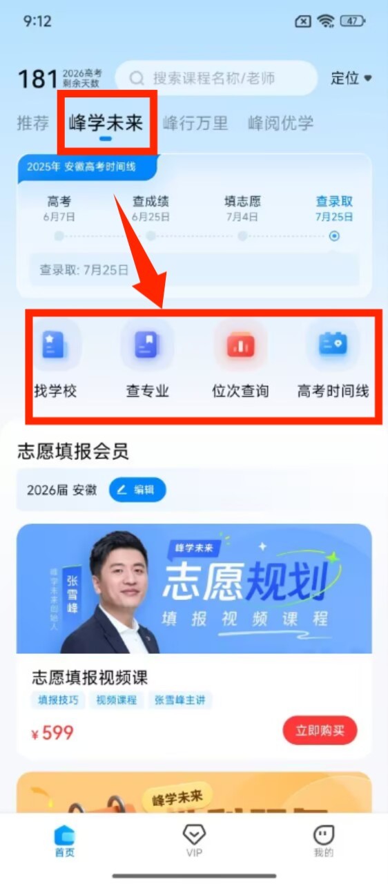 3、打开峰学未来板块,借助找学校、查专业等工具,获取高考相关的院校与专业信息。